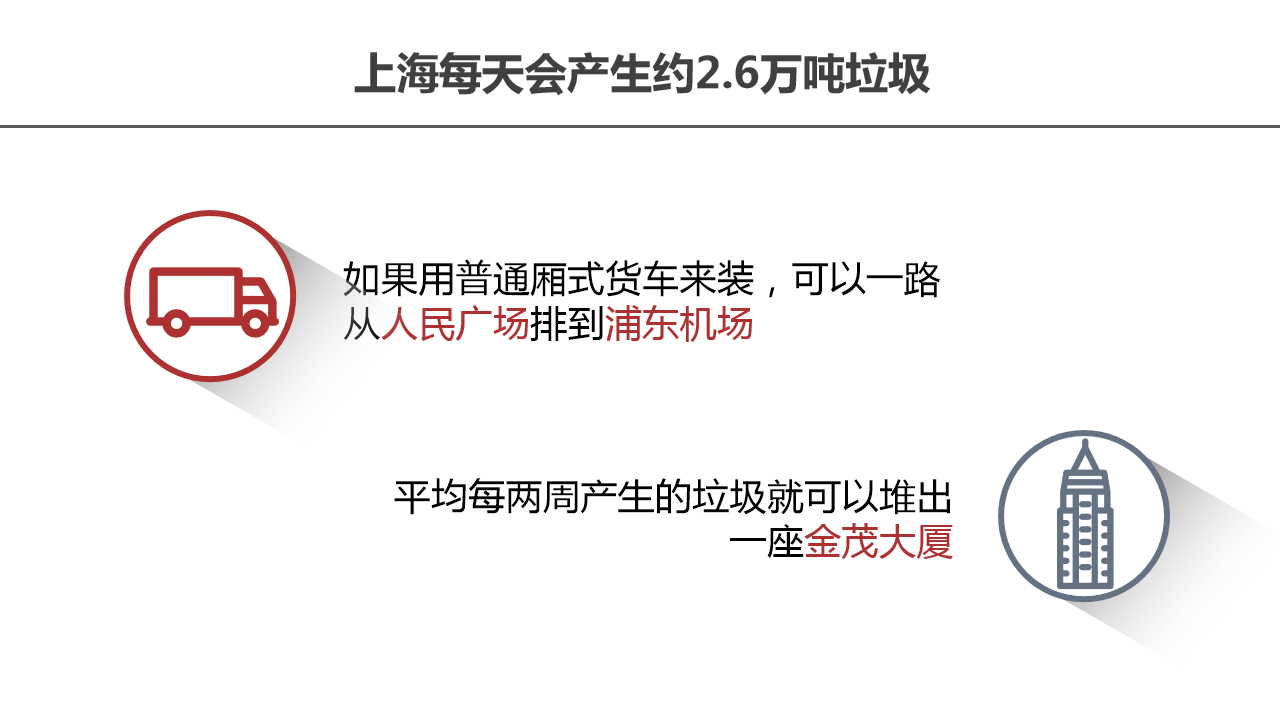 为什么上海要推行垃圾分类呢?根据 2017 年人口普查数据显示,上海拥有 2400 余万常住人口,600-700 万流动人口,平均每人每天产生一公斤左右的垃圾,那么每天的垃圾清运量就超过了 2.6 万吨。