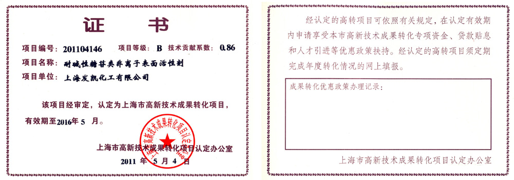 公司申报的“耐碱性糖苷类非离子表面活性剂”项目于2011年5月4日由上海市高新技术成果转化项目认定办公室认定为上海市高新技术成果转项目(沪高转2011第005号)。