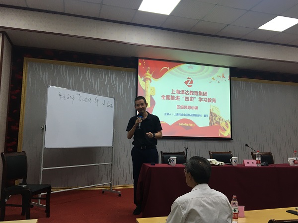 2020年9月3日下午,上海市金山区统战部副部长戴平到泽达进修学院多功能厅上主题教育党课,上海市健康安全环境研究会全体员工、欧美同学会金山分会部分会员、结对单位的党政领导参加了本次讲座。依据历史节点和背景,了解历史事件和人物,知晓历史思想和影响是学习“四史”的重要关键。从中日甲午战争到红军长征,从朱毛井冈山会师到毛主席人生中的四个重要“九月九日”,从抗美援朝到中美关系,戴部长以生动风趣的语言讲述历史故事,大家深刻认识到认识红色政权来之不易、新中国来之不易、中国特色社会主义来之不易。