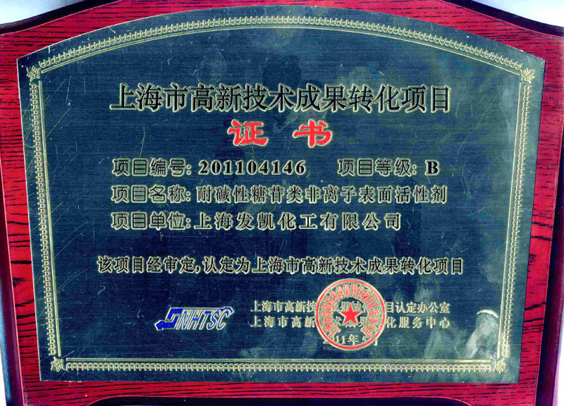 公司申报的“耐碱性糖苷类非离子表面活性剂”项目于2011年5月4日由上海市高新技术成果转化项目认定办公室认定为上海市高新技术成果转项目(沪高转2011第005号)。
