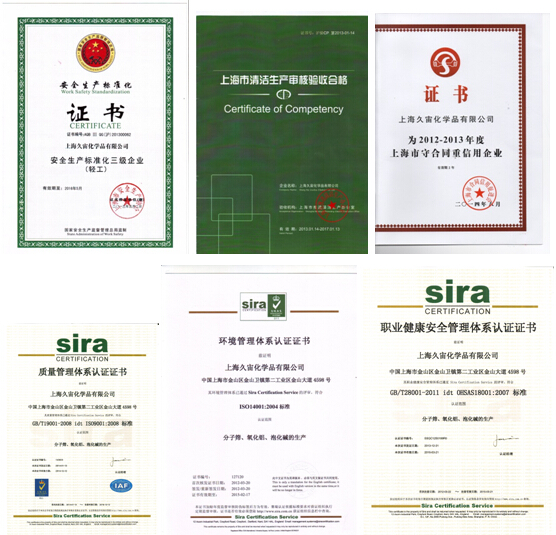 上海久宙化学品有限公司(SJC)创办于2002年,位于上海金山精细化工产业园区金山大道4598号(卫六路以西500米),占地面积21000平方米,建筑面积12000平方米。注册资金1150万元人民币。为加强管理,公司先后顺利通过了安全生产标准化、清洁生产验收合格、ISO9001:2008质量管理体系、ISO14001:2004环境管理体系和GB/T28001-2001职业健康安全管理体系认证获得相关证书,并于2013年底顺利通过三体系合一的评审。公司的主营产品有:分子筛原粉系列、分子筛系列、活性氧化铝系列、4A沸石助剂、硅酸钠(液体泡花碱)以及高温氧化铝、氢氧化铝填料系列等。