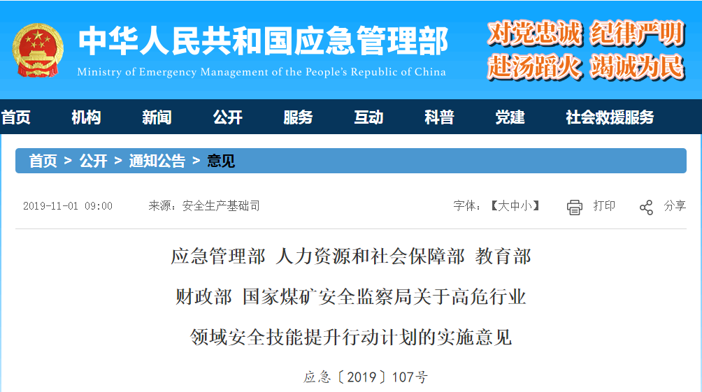 今日,中华人民共和国应急管理部、人力资源和社会保障部等五部门联合印发《关于高危行业领域安全技能提升行动计划的实施意见》(以下简称《意见》)。