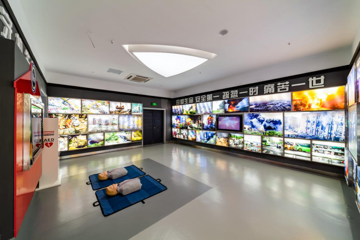 展厅分为两部分,进门后首先引入眼帘的是VR设备,包含社区安全、作业安全以及校园安全的内容,用沉浸式的体验,让游客们在体验中学习,在互动中提升。部分游客可以先行体验墙后放置的心肺复苏的人体模型,由工作人员演示AED设备的使用,配合电子屏幕滚动播放事故发生的瞬间,突出珍惜生命,安全第一的主题。