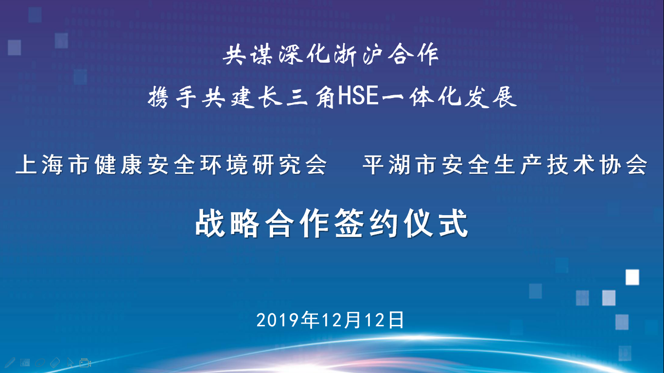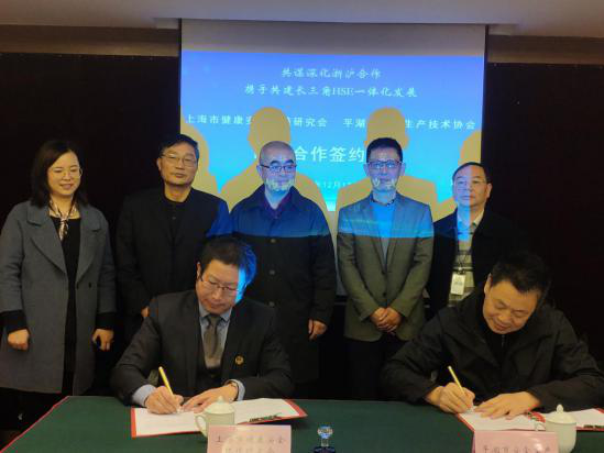 2019年12月12日,为共谋深化浙沪合作,携手共建长三角HSE一体化发展,上海市健康安全环境研究会与平湖市安全生产技术协会于金山宾馆正式签约成为战略合作伙伴。