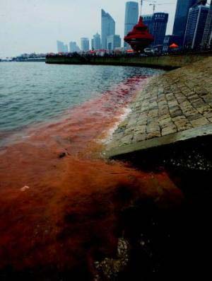 5月2日上午,五四广场东南侧海域的海面上出现大量红色的漂浮物,长约三四百米、宽约四五米。经青岛市环保局市南分局环境监测站工作人员现场查看,红色漂浮物怀疑是广场附近的建筑工地违规排污所致。
