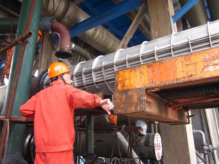 图为6月4日,该部联系的检修人员在起吊安装冷却器管束